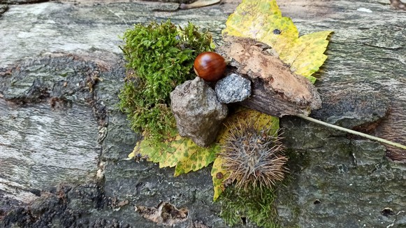 Spannenderweise konnte die Person das Bildelement (Kastanienhülle) erst nach mehrmaligen Versuchen ins Gesamtbild integrieren, da sie immer wieder vom Baumstamm hinunterrollte.